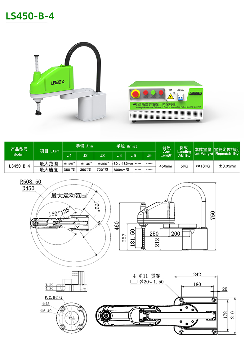 活動半徑450mm,負(fù)載5kg,4軸自由度